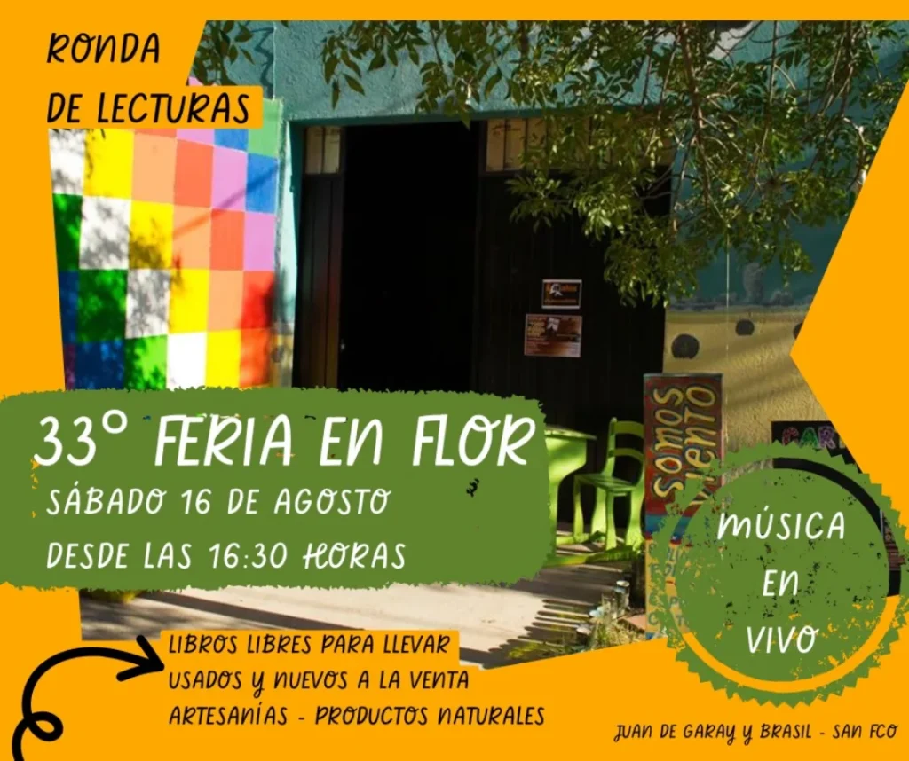 Este sábado 16 de agosto, a partir de las 16:30, el espacio cultural Somos Viento (Juan de Garay y Brasil) se llenará de color y vida con una nueva edición de la Feria en Flor. La propuesta invita a recorrer puestos con libros libres para llevar, ejemplares usados y nuevos a la venta, artesanías y productos naturales, en un ambiente que combina creatividad, encuentro y economía local.