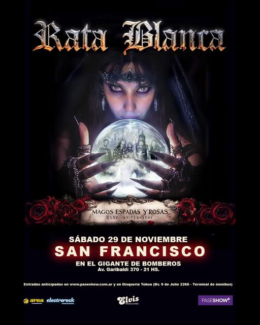 El sábado 29 de noviembre a las 21 h, Rata Blanca regresa a la ciudad para presentar un show que celebra el 35° aniversario de Magos, espadas y rosas, su disco más emblemático y uno de los más influyentes del rock argentino.